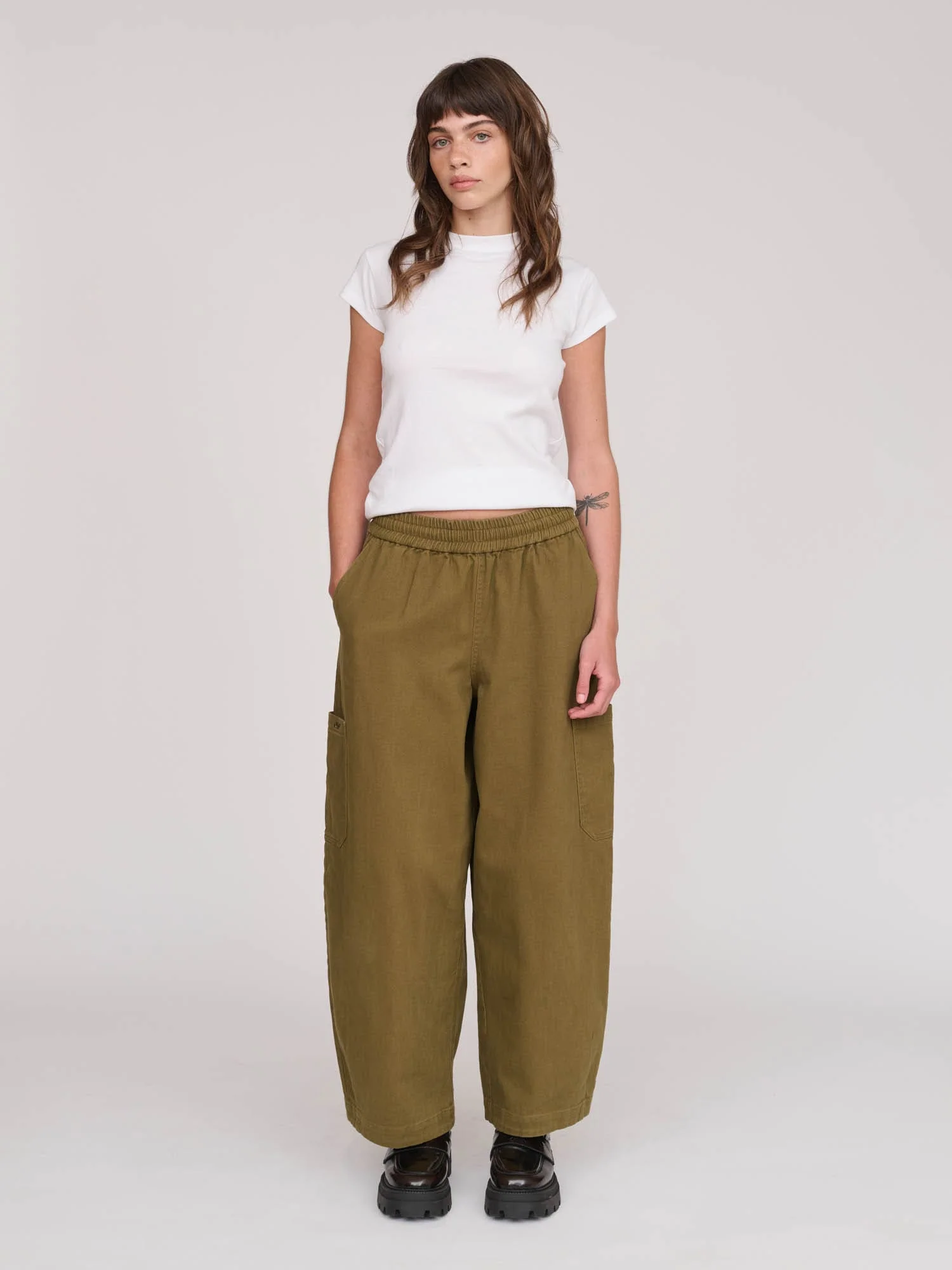 Bev is back in khaki; one of our new trouser styles, Bev’s got a barrel leg and an elasticated waistband with an internal drawcord, plus there’s pockets at the hips, leg and back. With a 71cm inseam, they feature both a tonal embroidered branding as well as a woven patch label and this iteration is made from a heavyweight cotton. Do you wanna know the best part about Bev? She’s also available in pink too.