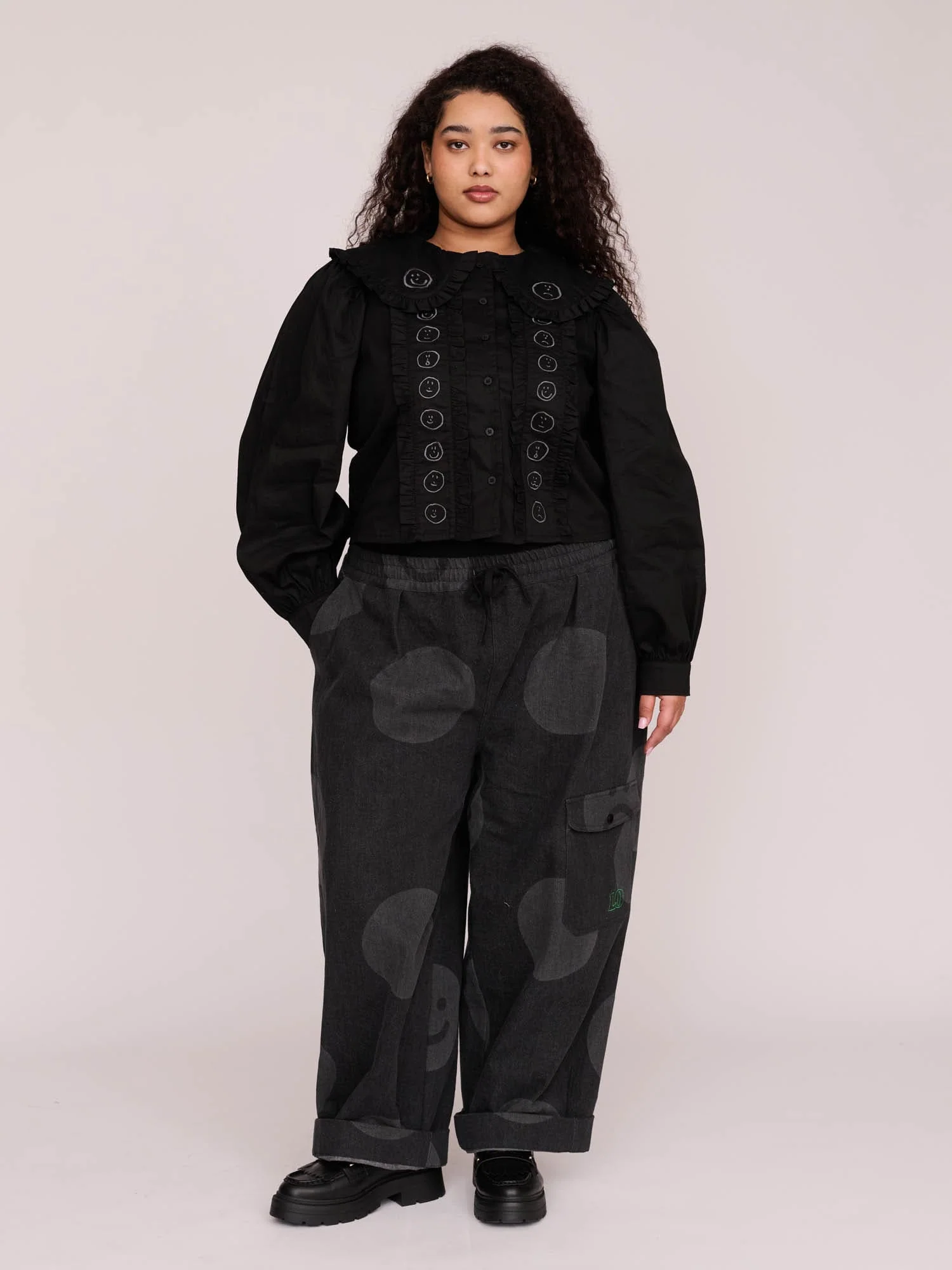 Made 100% cotton, this black, long-sleeve shirt has puffed sleeves with functional button cuffs along with an oversized collar. The star is the white Happy Sad embroideries on both the front panels and collar, with both also featuring ruffle trim details. With black, branded buttons; why not style with our Trev’s in Navy and our Emotional Flower Cardigan?