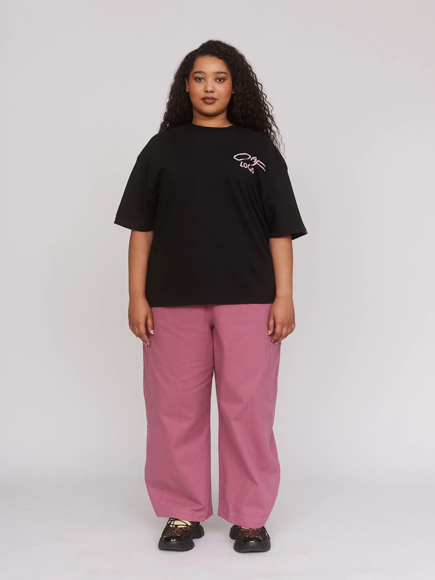 Our bread and butter, our unisex tee shape is a great place to start your Oaf collection. Made from 100% cotton, it has a relaxed fit with a slightly dropped shoulder and a ribbed neck and is finished off with an Oaf pip label at the cuff. In black, this iteration features a chest and back graphic drawn up by Gem. Pair with our Bev Trousers in Dark Pink for an easy everyday look that isn’t a bore.