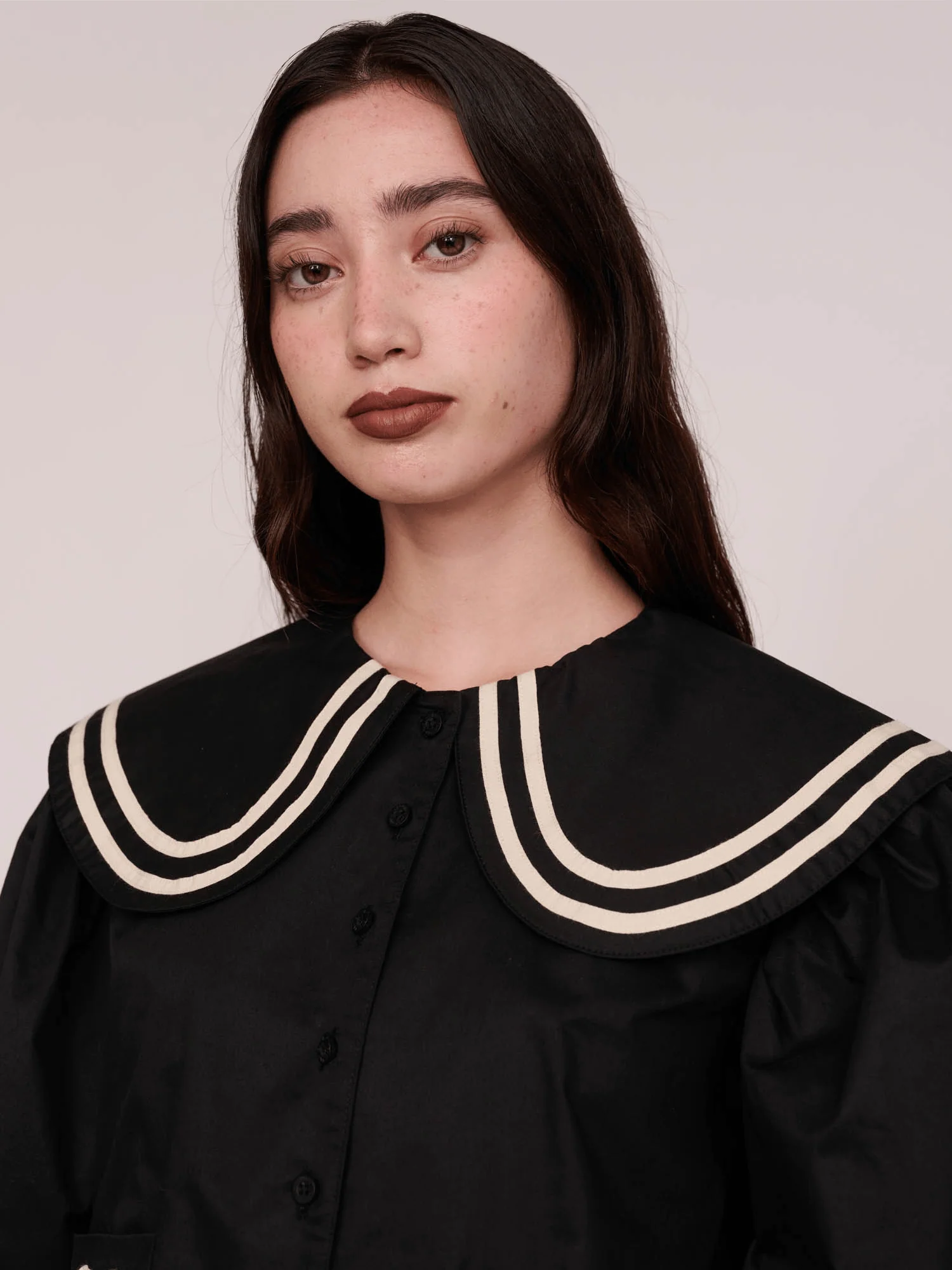 Made from 100% cotton this button down shirt has an oversized collar with a sailor stripe trim. The long, puff sleeves have adjustable tie cuffs and on the front of the shirt are patch pockets with contrasting heart trims. With a woven patch label detail, pair this shirt with one of our Bev, Kev or Trevs and our Slimbos for a look that’ll take you from day to night.