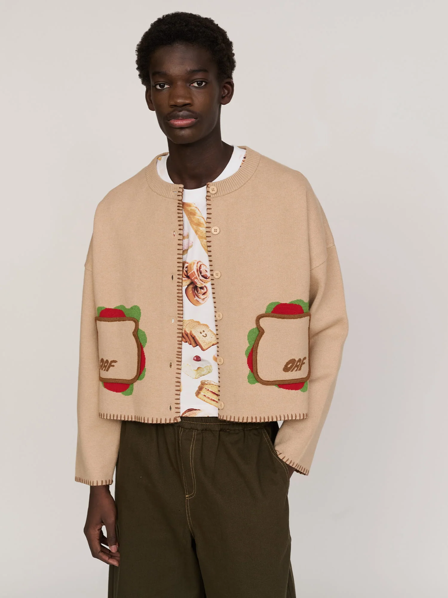 This thick, knit cardigan has a relaxed fit with a dropped shoulder and ribbed neckline. In beige, it has sandwich-shaped pockets as well as contrasting blanket stitch detailing on the cuffs, placket and hem. If you're like us and two sandwiches just aren’t enough, you’re gonna want to style this with our Lazy Loaf Crochet Style Bag.